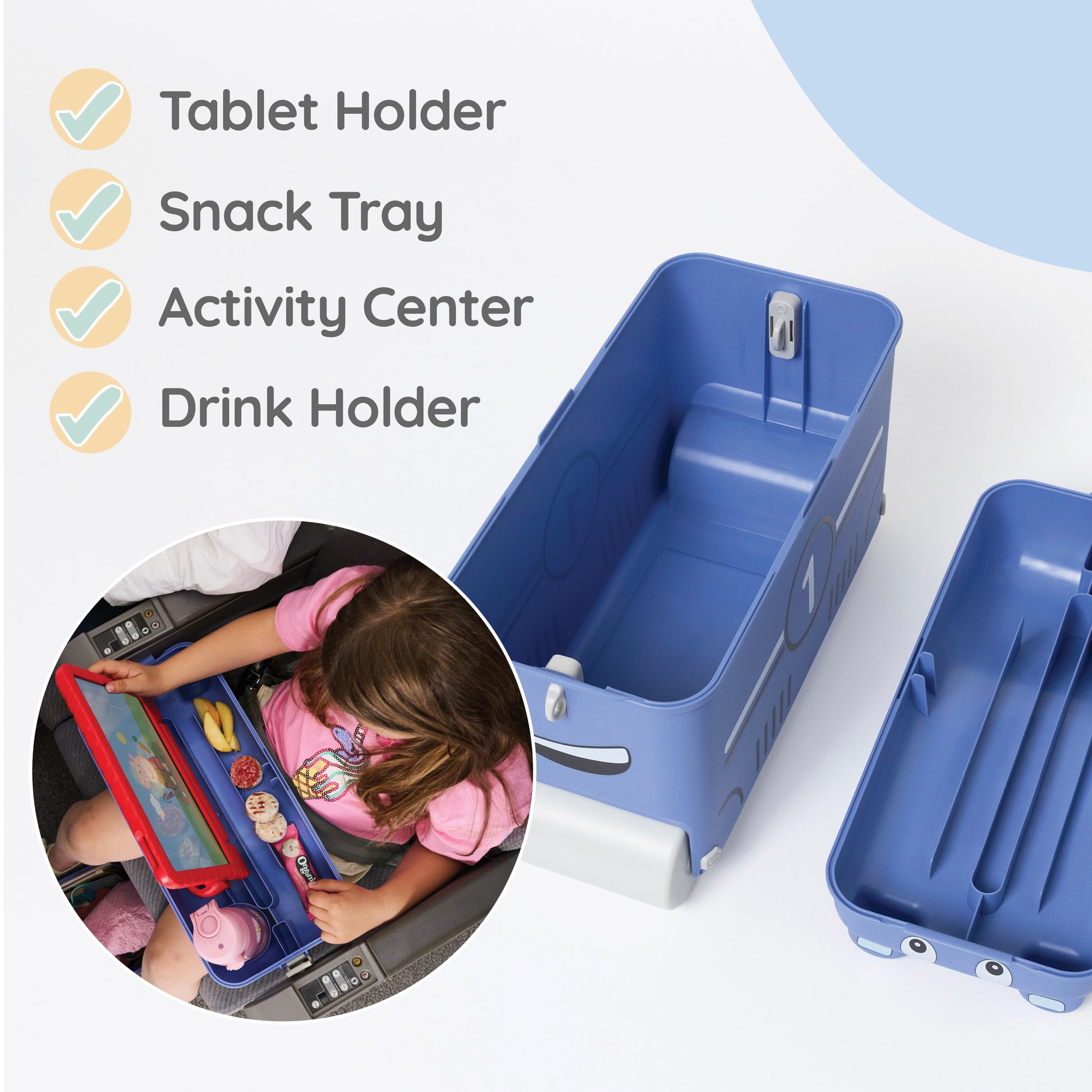 The lockable, top-loading lid doubles as a lap tray with built-in tablet, phone, and drink holders, creating a self-contained, hygienic space for snacks, colouring or screen time while travelling.